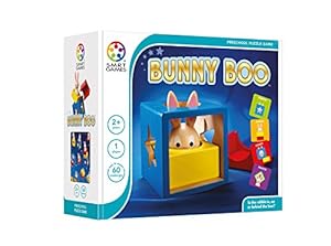 「バニー・ブー」は、木製のうさぎと赤・青・黄色の3つのパーツを、問題のカードに描かれた図と同じになるように並べたり積んだりするパズル。