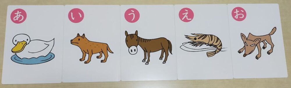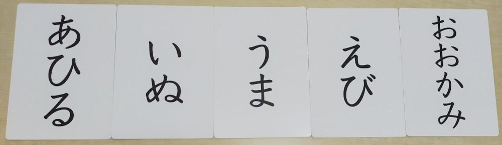 文字だけのカードを「あいうえお」の順に並べ、「いぬの『い』はどれ?」などと問いかけカードを取らせる。