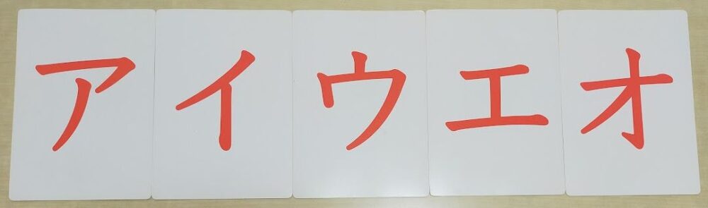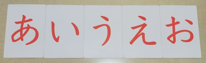 文字だけのカード5枚(あ行)を順番に並べ、指さしながら「あいうえお」と連続して読み上げ、復唱させる。