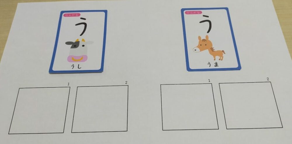 【教材】マス目に番号をつけた台紙、絵カード2枚、文字カード