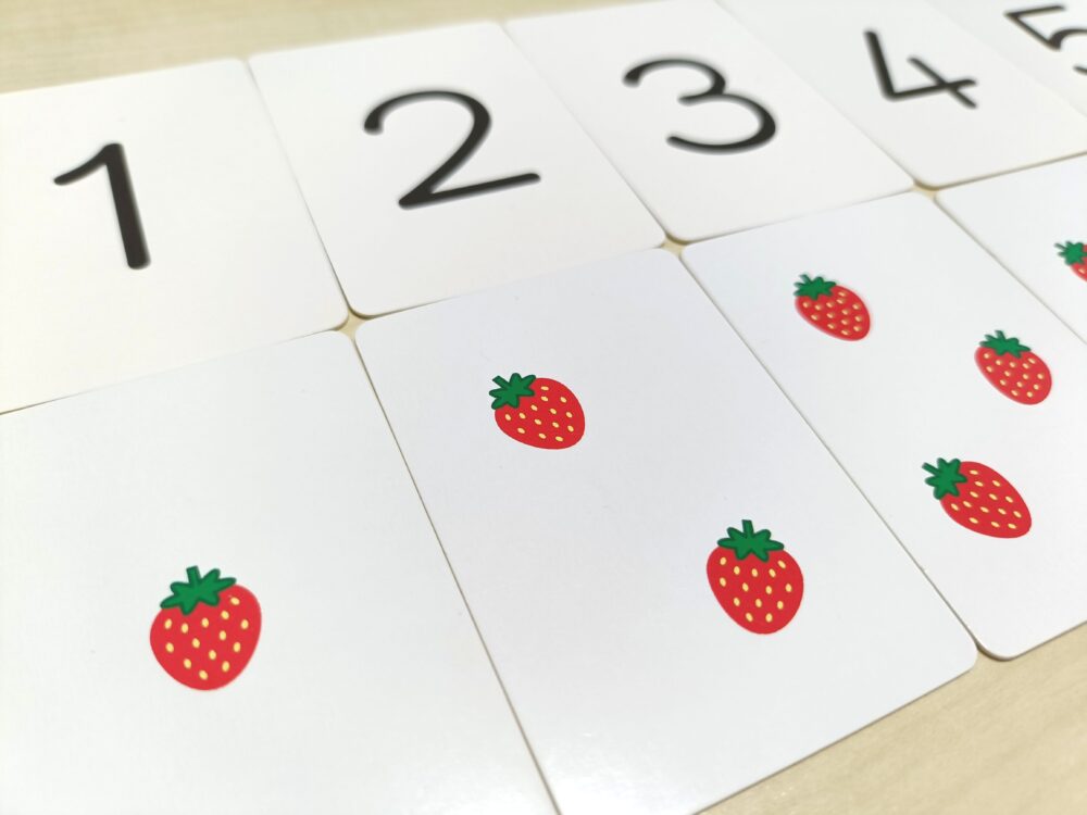 1~10個の絵が描かれた絵カードを2種類用意します。(例:イチゴの絵1~10とちょうちょの絵1~10など)