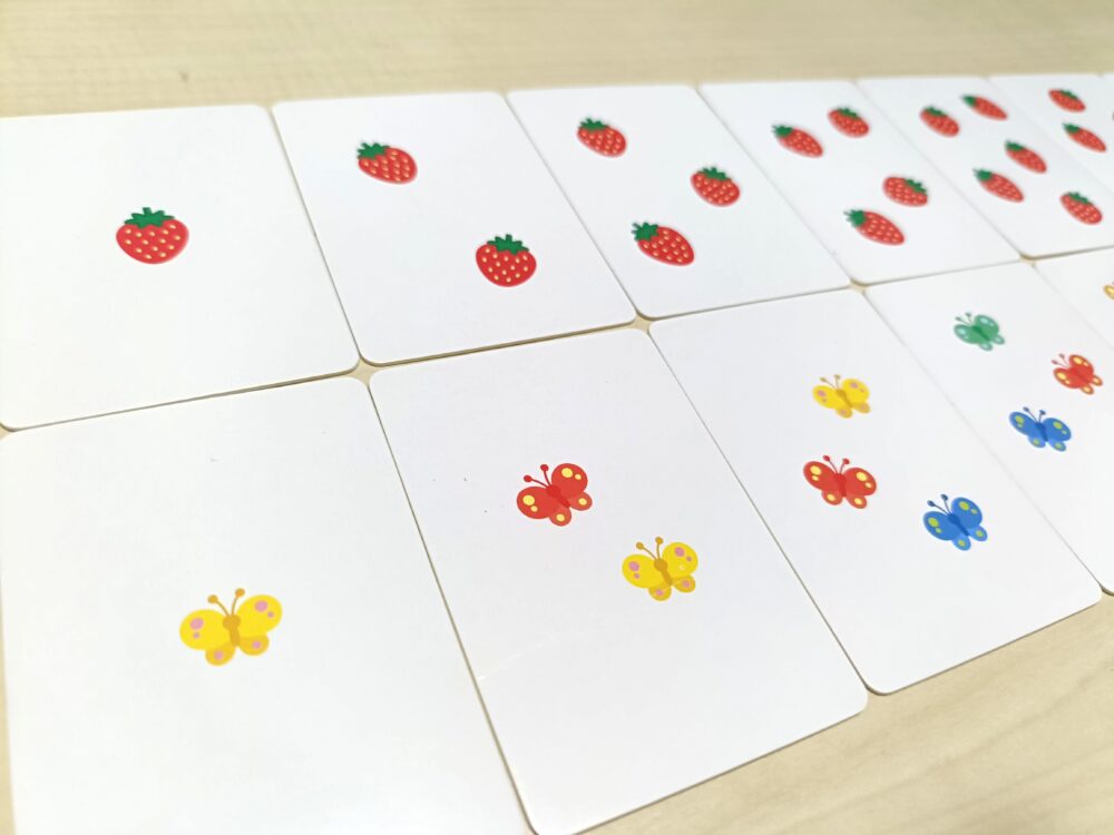 イチゴのカードを1~10まで順に並べ、同じ数のちょうちょのカードをマッチングさせます。