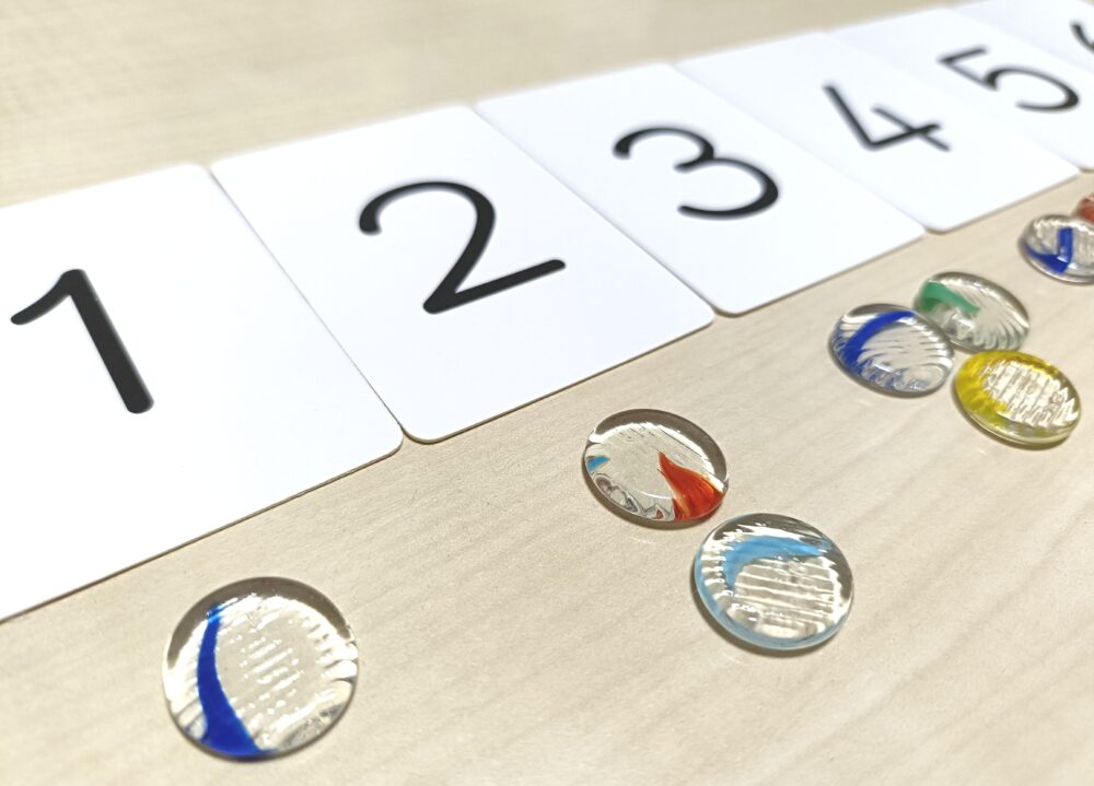 対応あそびの仕上げは、数字と具体物(おはじき)のマッチング。
